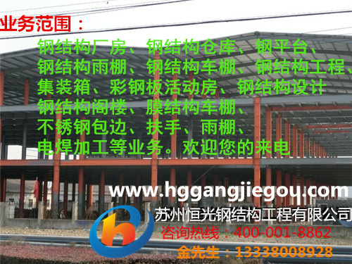 苏州恒光钢结构工程有限公司是钢结构厂房;钢平台;钢楼梯;钢爬梯;彩钢板;活动板房;车棚;车蓬;围栏;护栏;围墙;雨棚;连廊;隔断;吊 顶;通风器;屋面气楼建造;钢结构防水系统;厂房屋面开孔排风系统等产品;钢结构厂房维修等维修工程。公司具有雄厚的产品设计、制造、安装、维修实力。 公司实行现代企业制度管理,具有健全的管理制度,完善的控制程序,完整、科学的质量管理体系。灵活的经营机制,以“技术领先、实力雄厚、产品创新、诚信服 务”取信于广大用户。公司遵循“科学管理、质量第一、安全环保、顾客满意”的质量方针;“信誉第一、客户至上”是公司永恒的宗旨;用户的期望是公司永远追 求的目标。 公司的诚信、实力和产品质量获得业界的认可。 产品畅销国内市场,出口多个国家和地区。欢迎各界朋友莅临苏州恒光钢结构工程有限公司参观、指导和业务洽谈。 公司奉行:“诚信为本、质量第一、服务第一”的原则服务于社会。 公司坚信“材料是骨架、设计是灵魂、质量是生命”的理念,为你打造出安全、舒适的 空间。 联系人:金先生 电话 13338008928 苏州恒光钢结构工程有限公司 400-001-8862 联系人:金工 手机:13338008928 Email:5088264@qq.com ... [详细介绍] |